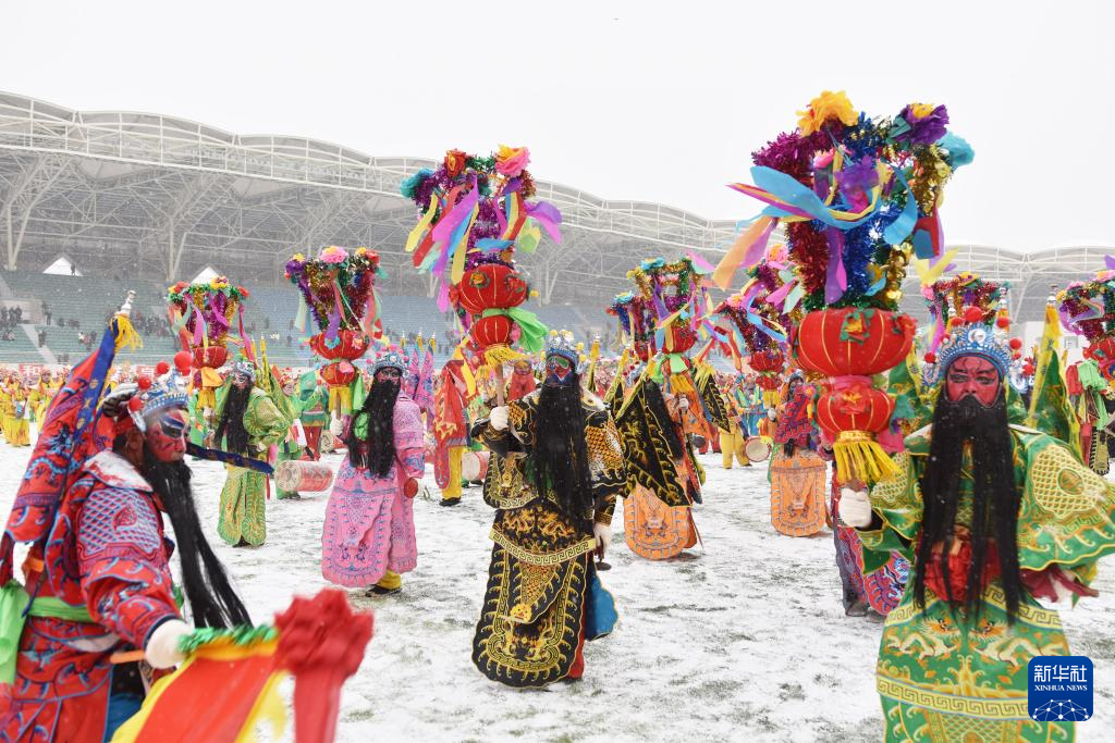 2月23日,在甘肃省临夏市体育场,社火队员在表演民俗节目“太傅”。