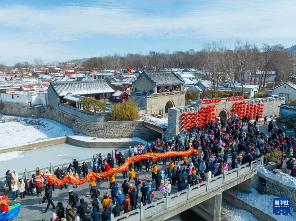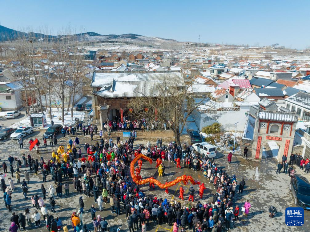 2月23日,在山东省济南市章丘区三德范村,村民进行舞龙表演(无人机照片)。