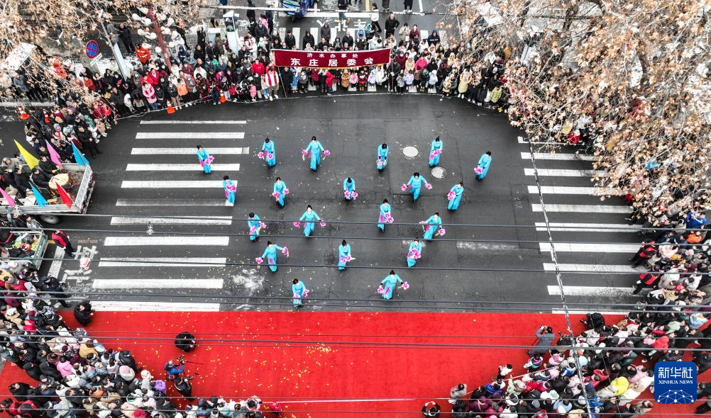 2月23日,河南省济源市济水街道的艺人在街头进行民俗表演(无人机照片)。