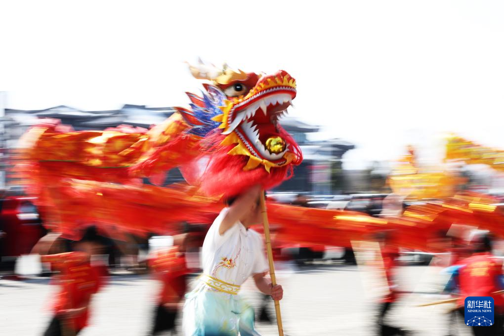 2月23日,舞龙队在山东省郯城县郯国古城景区表演。