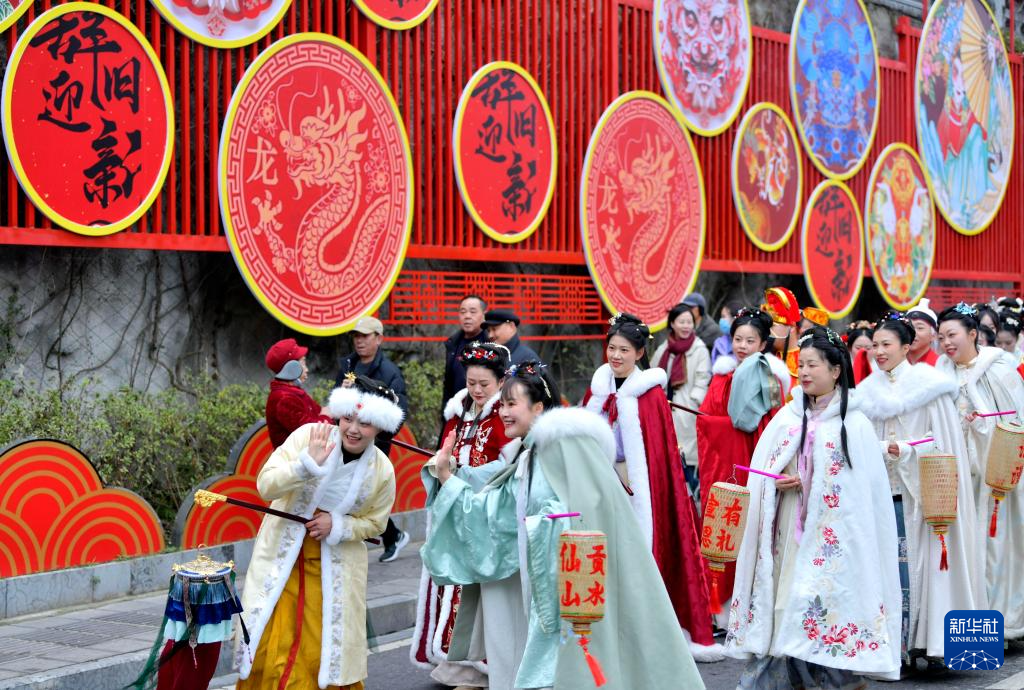 2月23日,人们身着传统服饰在湖北省宣恩县城兴隆老街参加民俗展演巡游活动。