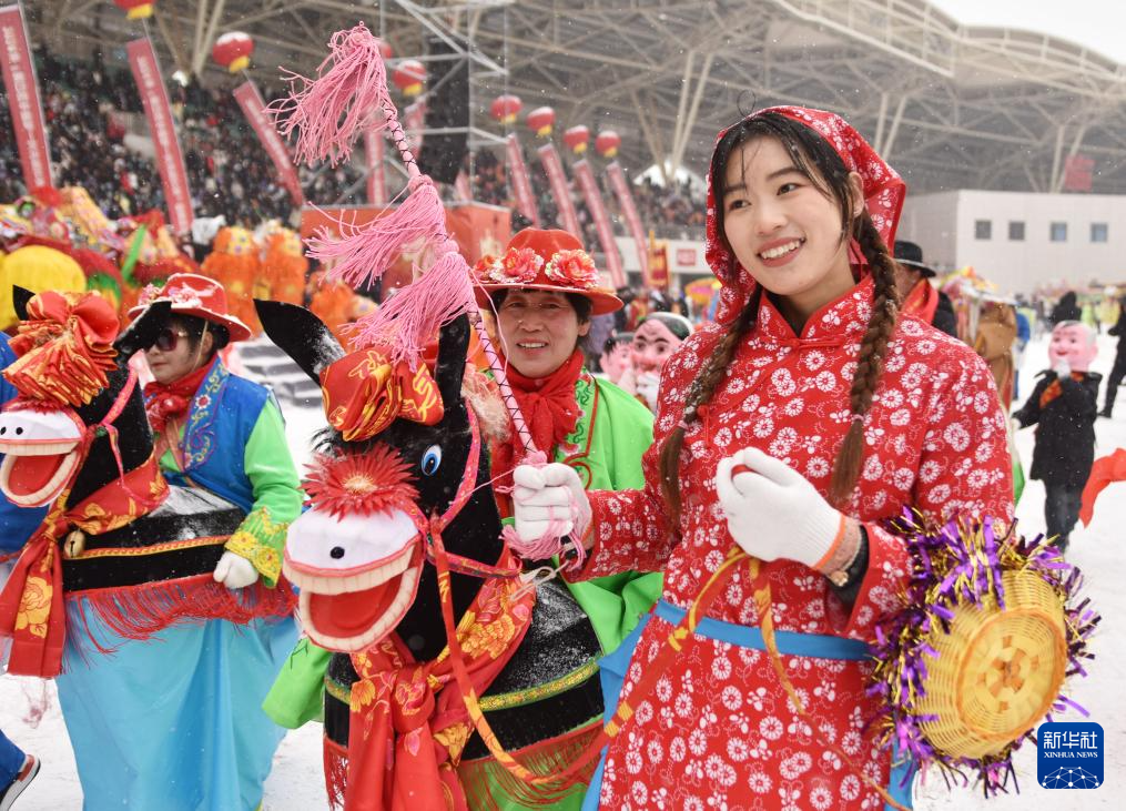 2月23日,在甘肃省临夏市体育场,社火队员在表演民俗节目“赶毛驴”。