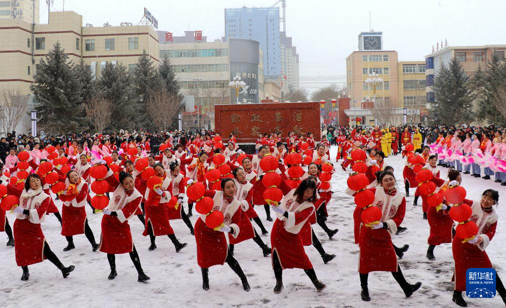 2月23日,在甘肃省平凉市静宁县政府广场,社火队在表演挂灯笼。