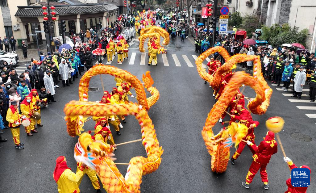 2月23日,舞龙队在浙江省湖州市德清县乾元镇第24届浙北乾龙灯会表演(无人机照片)。