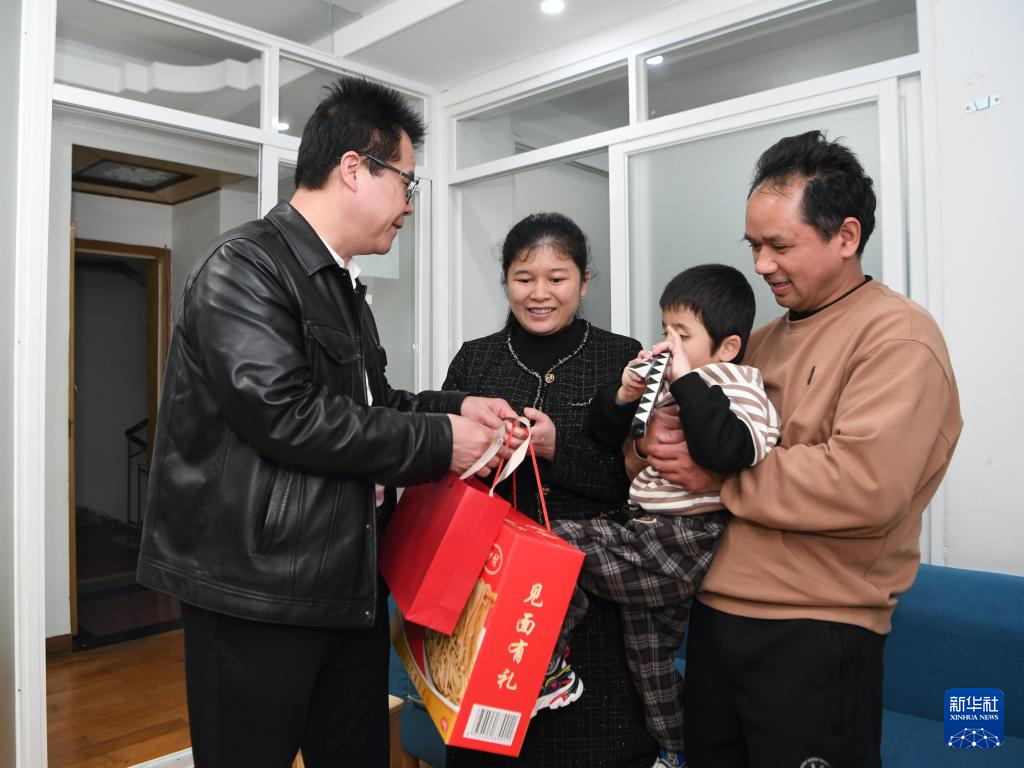 王永澄(左一)在福州市鼓楼区红墙巷小区为盲人家庭送来新春慰问(2月18日摄)。