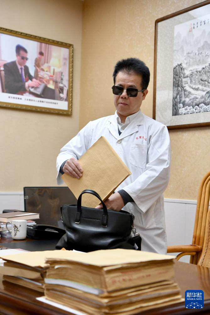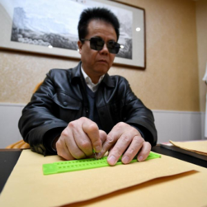 王永澄在福州市海峡盲人按摩指导中心的工作室整理盲文建议材料(2月6日摄)。