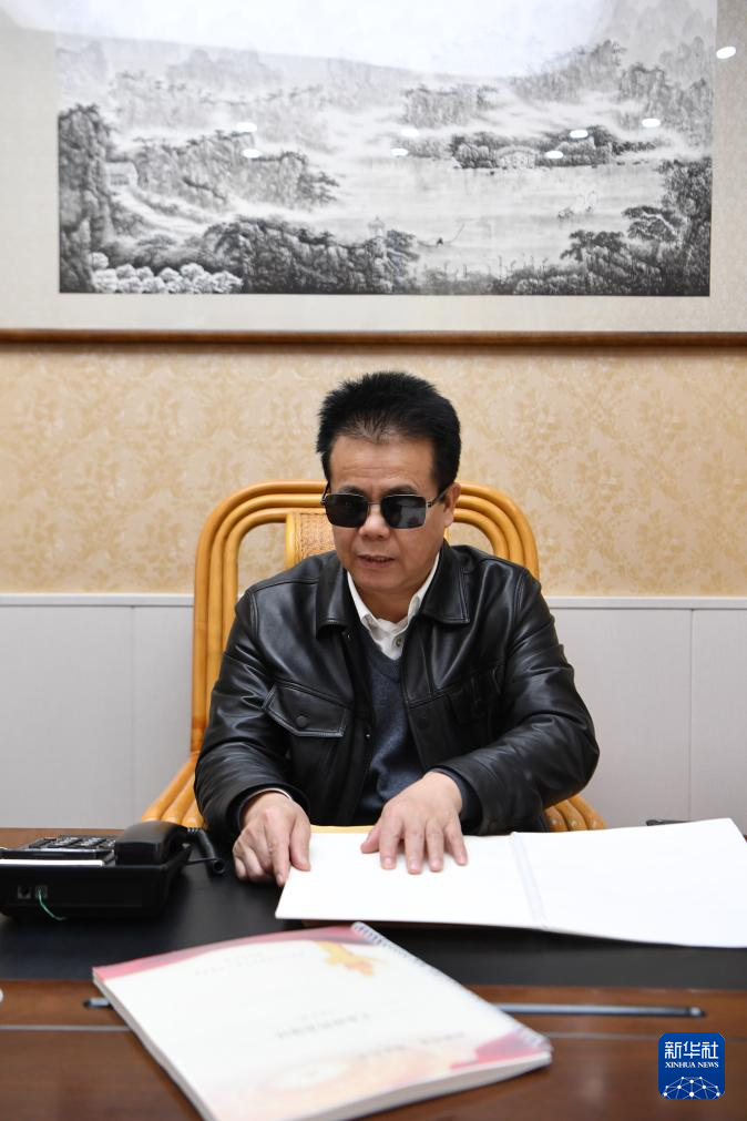 王永澄在福州市海峡盲人按摩指导中心的工作室阅读盲文版代表建议答复(2月6日摄)。