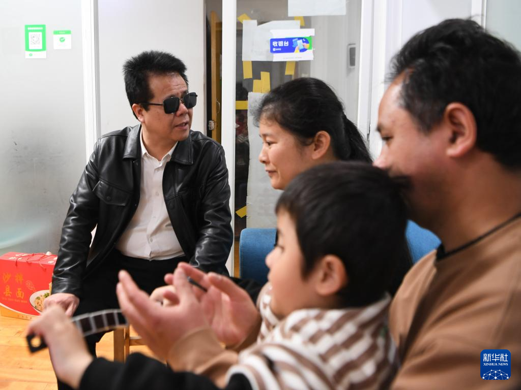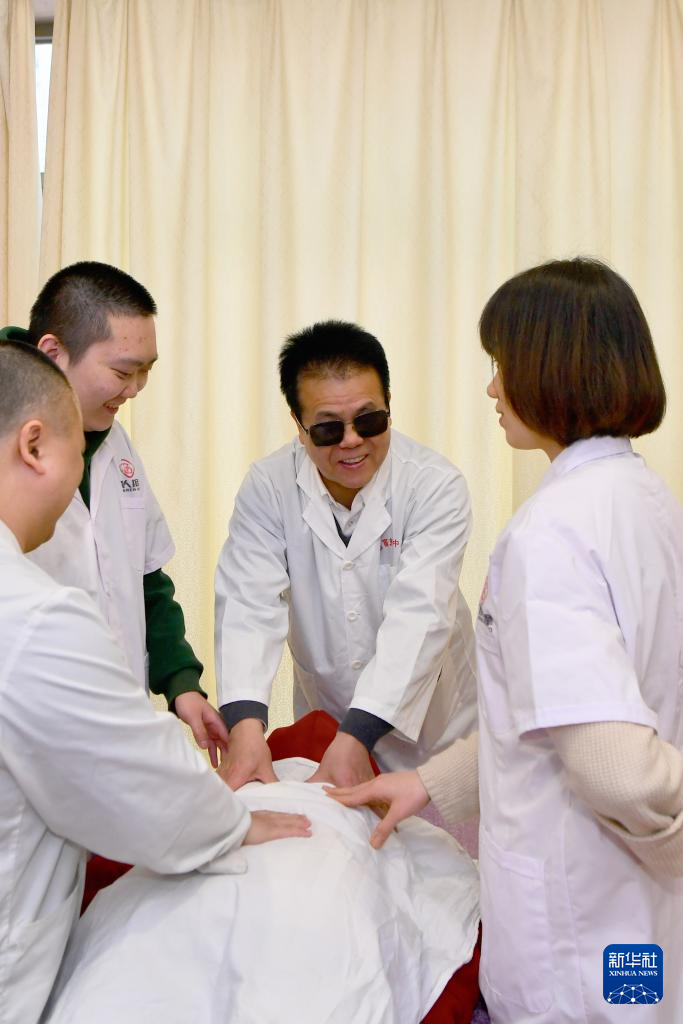 王永澄(右一)在福州市海峡盲人按摩指导中心为盲人朋友传授盲按要领(2月6日摄)。