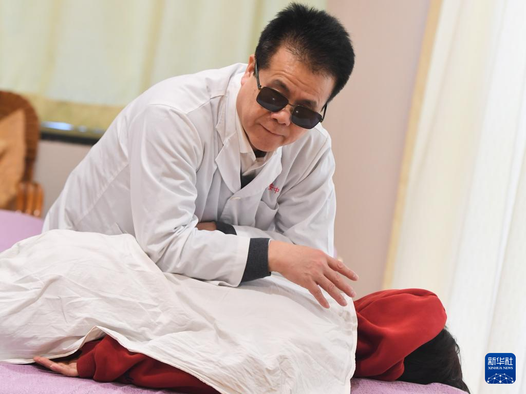 王永澄在福州市海峡盲人按摩指导中心为盲人朋友演示盲按手法(2月6日摄)。