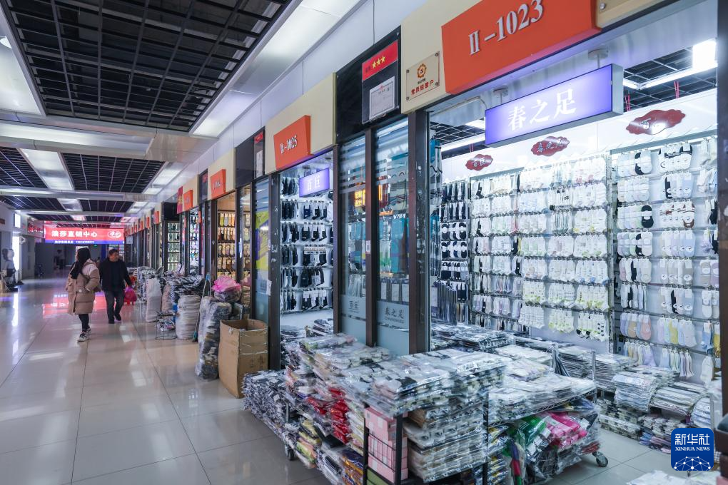 2月24日,位于诸暨大唐街道的中国大唐袜业城内,商铺店员在整理货品。