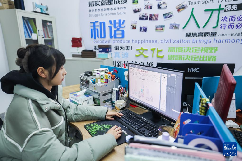 2月24日,在位于诸暨的浙江凯诗利科技有限公司的设计部门内,设计人员在设计新款袜子。