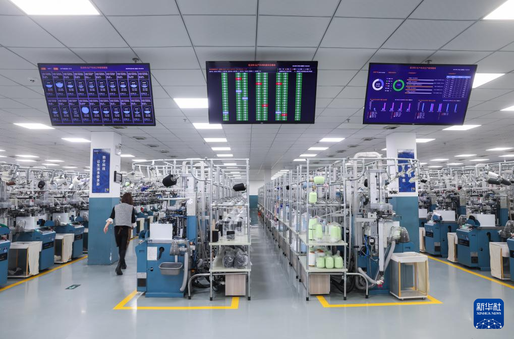 2月24日,在位于诸暨的浙江凯诗利科技有限公司的数字化车间内,织缝翻检智能一体袜机正在生产一批春夏款潮袜。智能一体机整合了袜子织造、缝头、翻袜这三道工序,不仅有效减少原材料消耗,还能大幅提高生产效率。
