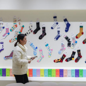2月24日,一名女子从位于诸暨市的浙江凯诗利科技有限公司袜子样品展示墙前走过。