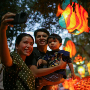 2月23日,在新西兰最大城市奥克兰,人们在元宵灯节上合影留念。