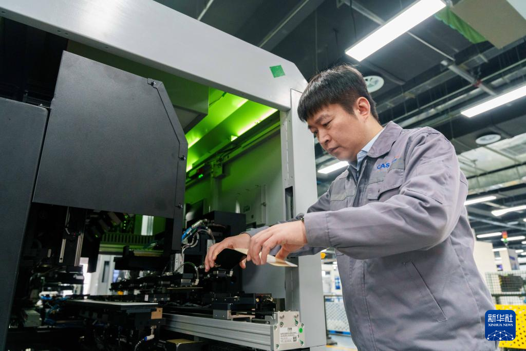 2月3日,在河南洛阳中科慧远总部,张正涛从外观缺陷智能检测设备中取出检测完毕的手机玻璃背板。
