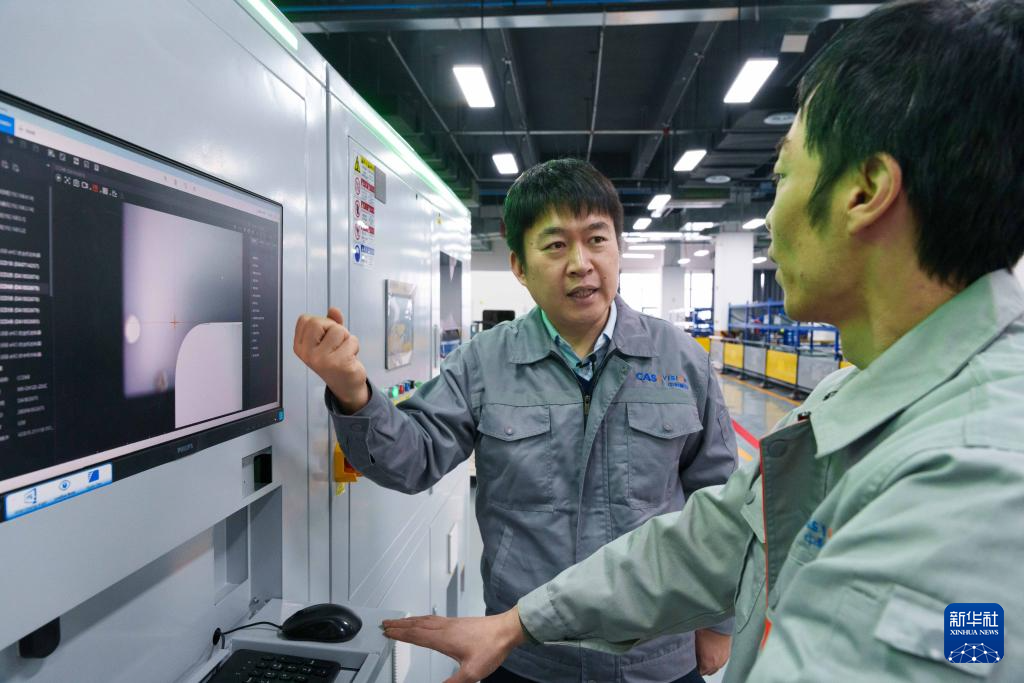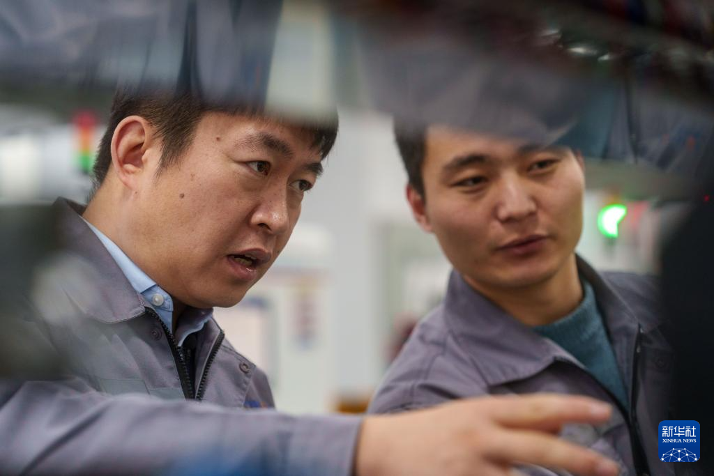 2月3日,在河南洛阳中科慧远总部,张正涛(左)和同事交流外观缺陷智能检测设备的面板操作方法。