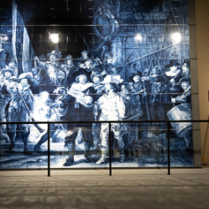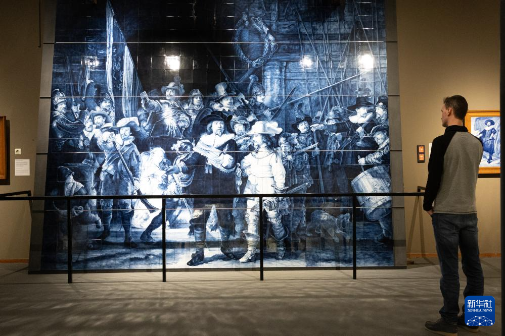 2月23日,参观者在荷兰皇家代尔夫特陶器厂参观伦勃朗著名画作《夜巡》的陶瓷复制作品。