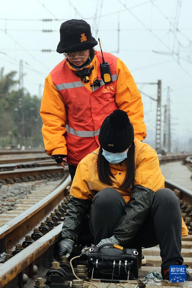 在焦柳线洛满站,柳州工务段柳州女子探伤班对钢轨焊缝处进行探伤作业(2月23日摄)。