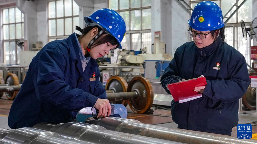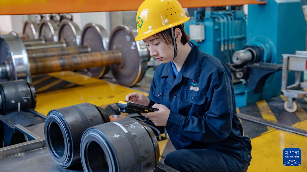 柳州车辆段车轮车间女工在测量轮座部位尺寸数据(2月22日摄)。