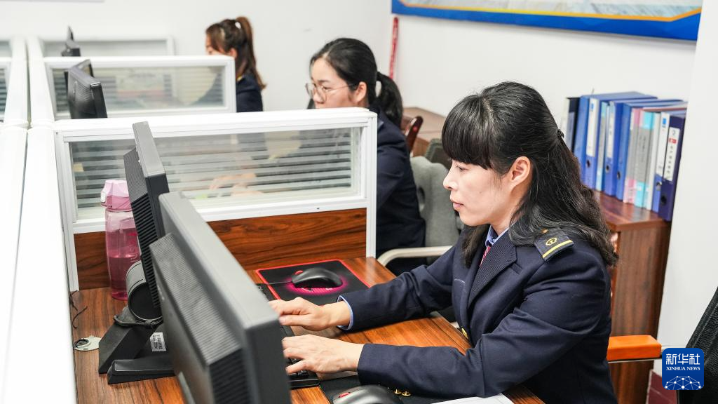 柳州车辆段车轮车间一名女工在录入轮对轴承数据(2月22日摄)。
