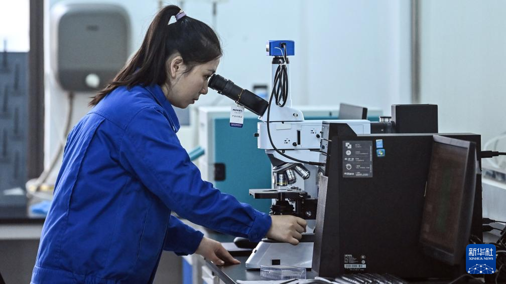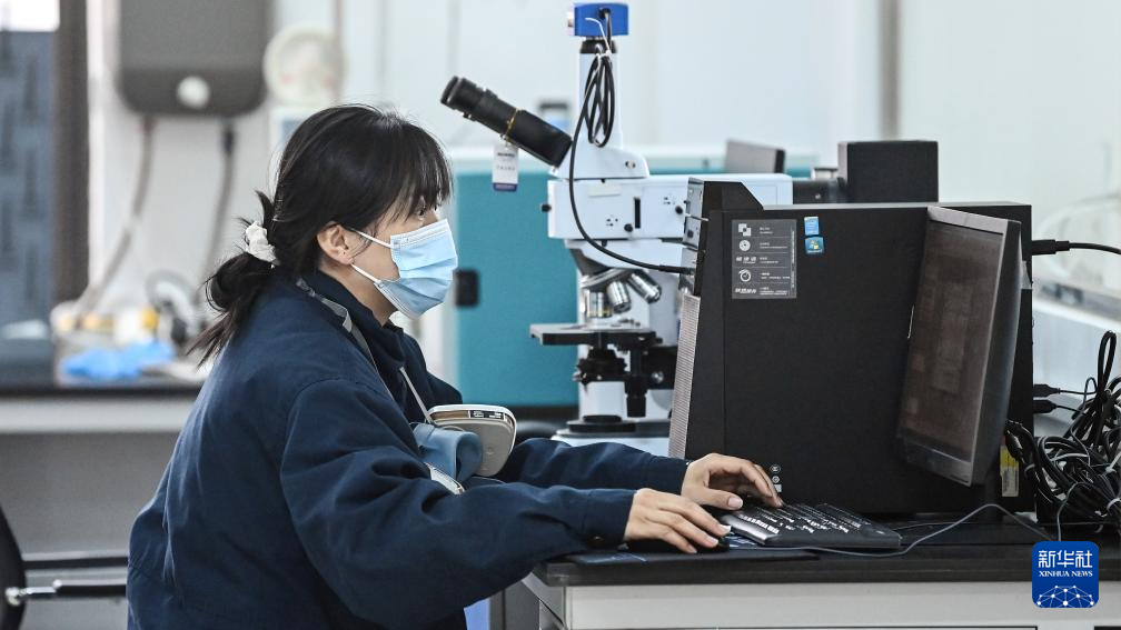 柳州工务机械段一名女工用显微镜观测大机油样,记录分析数据(2月24日摄)。