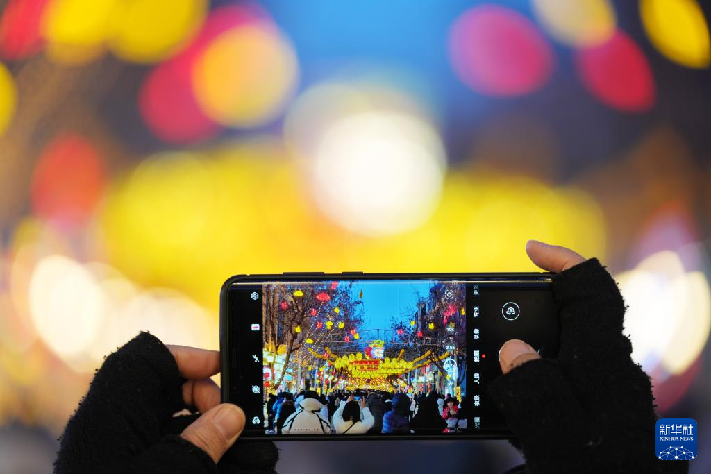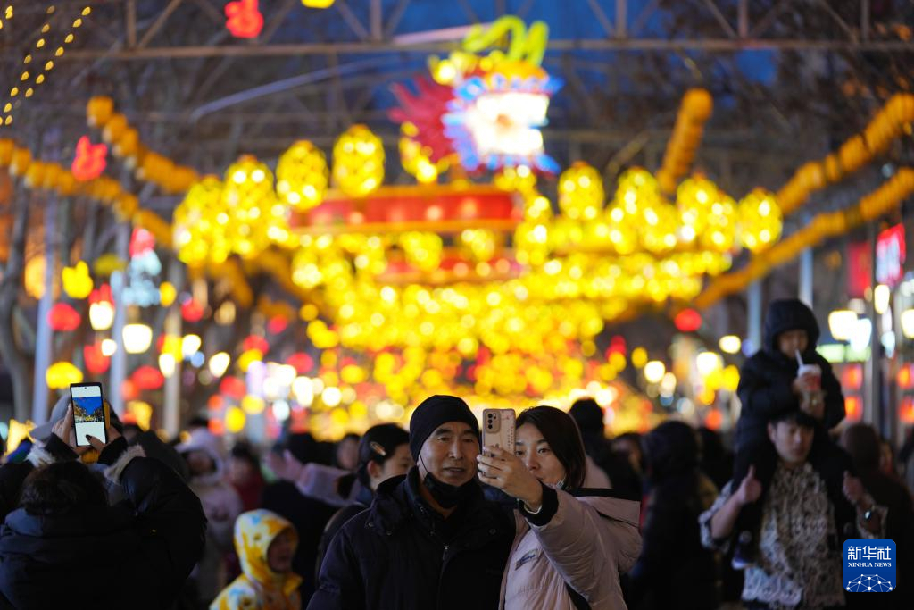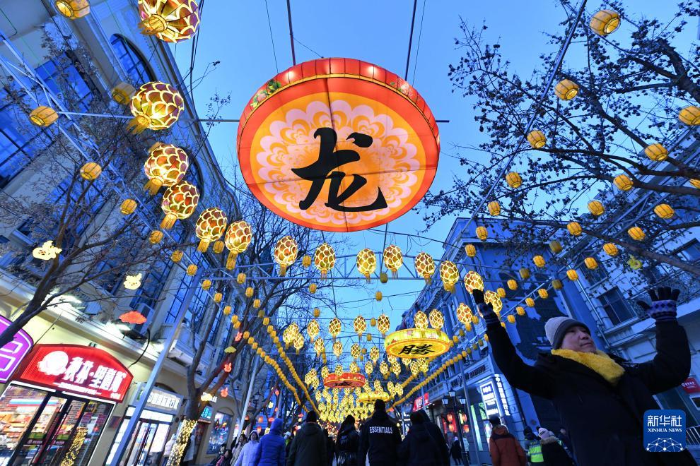 2月24日,在哈尔滨中央大街,游客在拍摄龙灯。