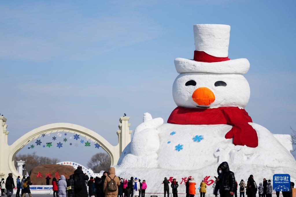 2月24日,在哈尔滨太阳岛雪博会园区门口,游客在大雪人前留影。