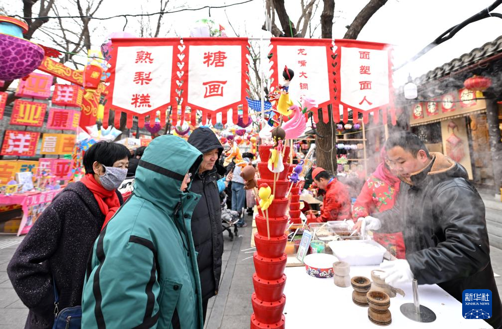 2月24日,游客在天津市西青区杨柳青古镇购买特色小吃。