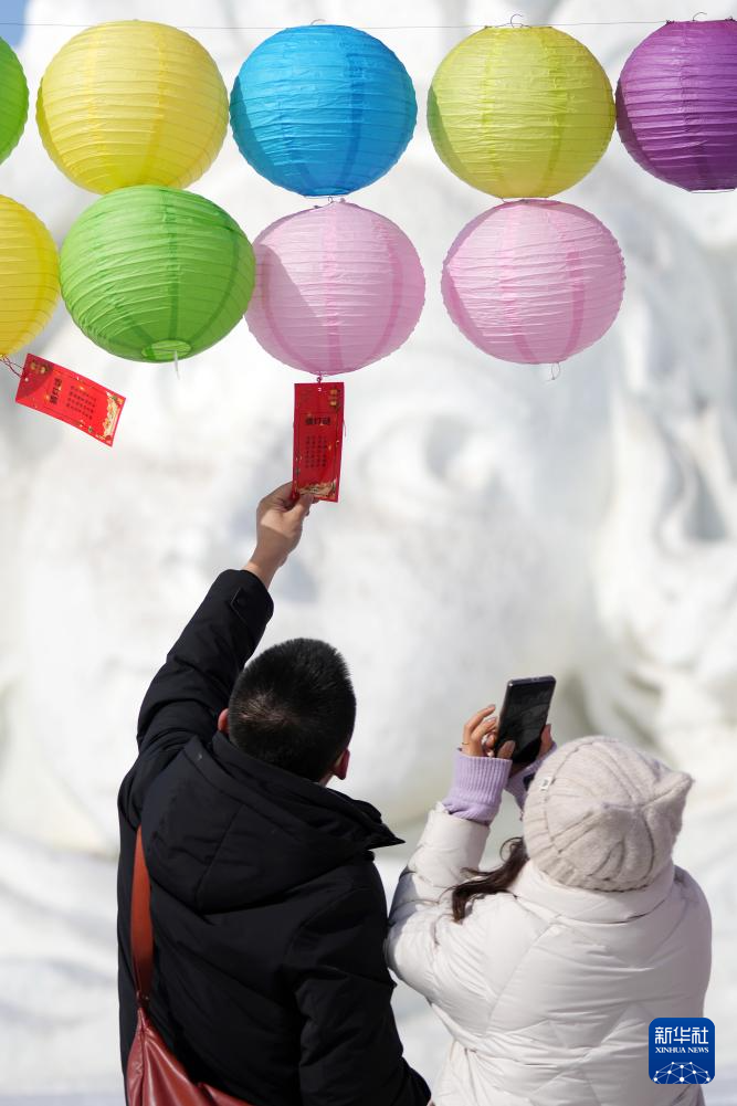 2月24日,游客在哈尔滨太阳岛雪博会园区内猜灯谜。