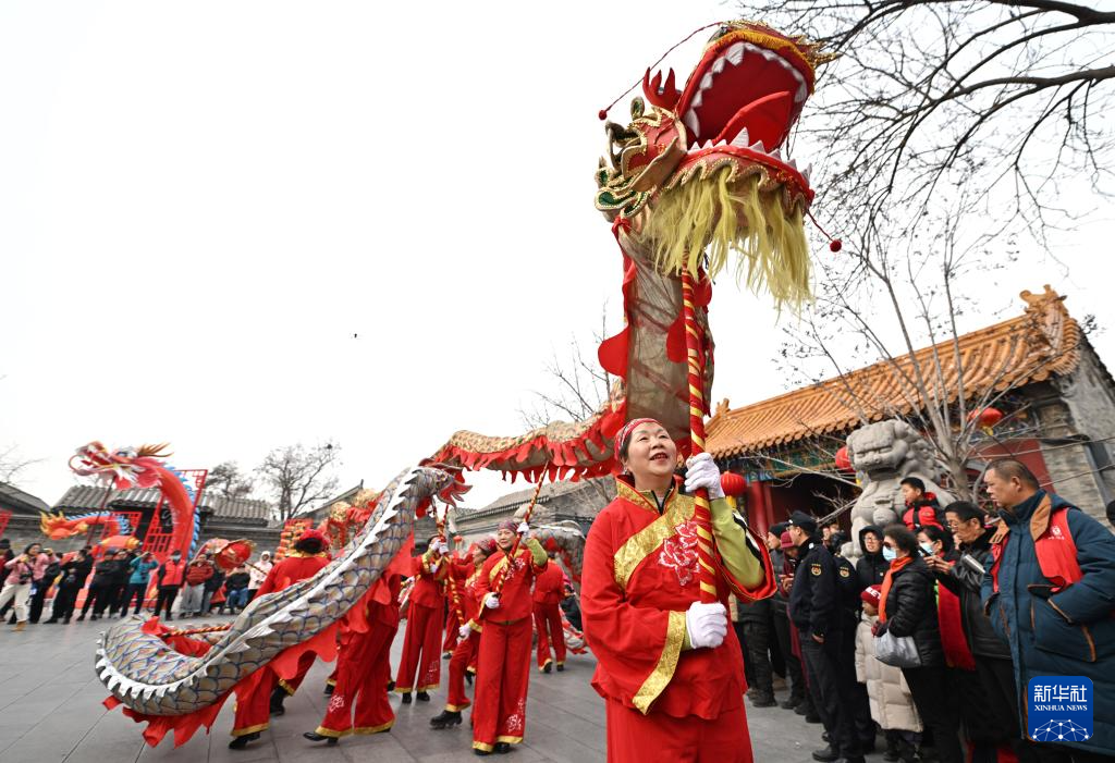 2月24日,游客在天津市西青区杨柳青古镇观看舞龙表演。