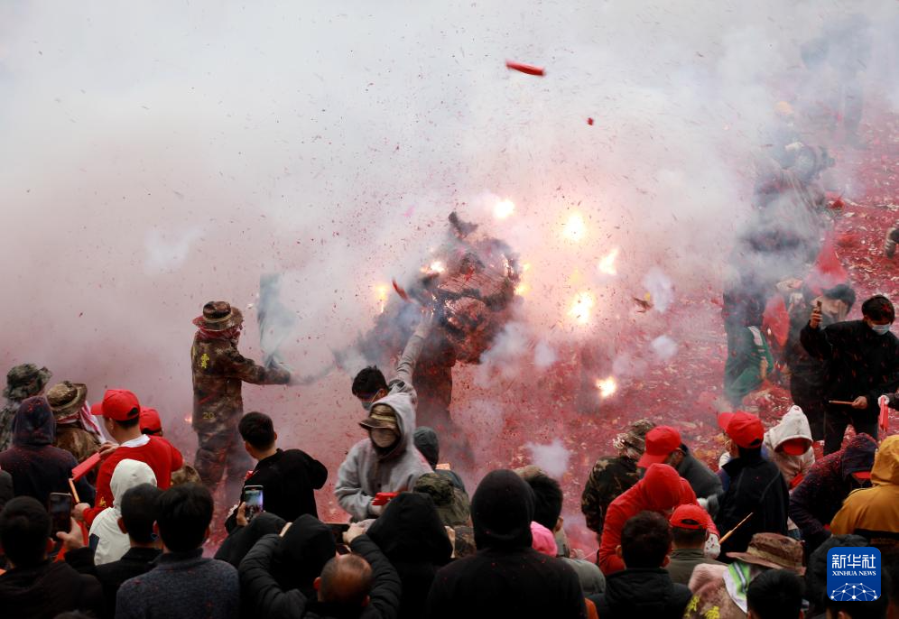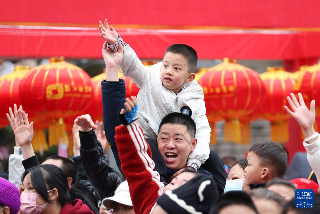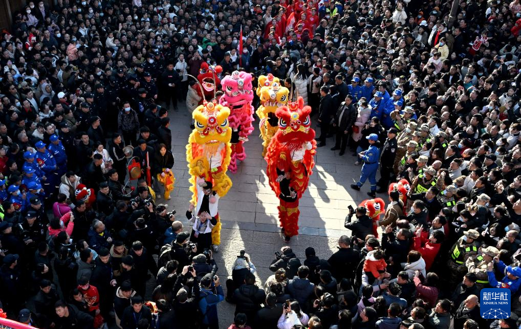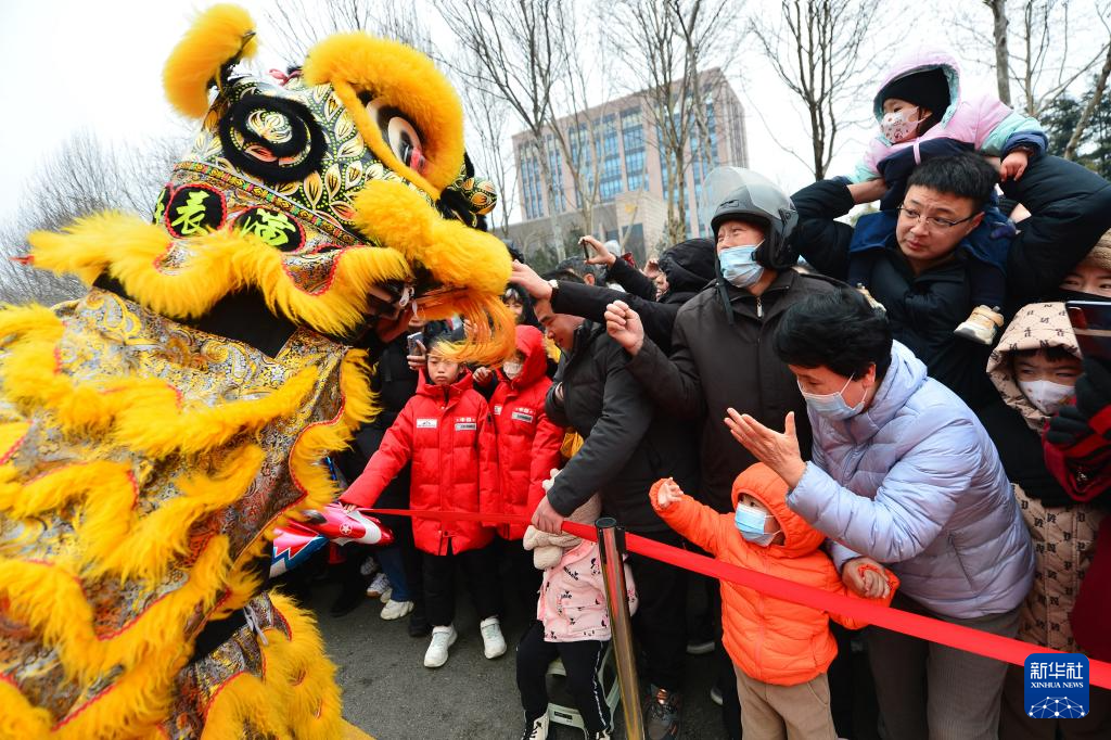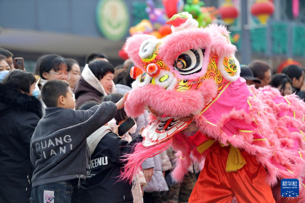 2月24日,在河北省石家庄市深泽县,舞狮演员与群众互动。