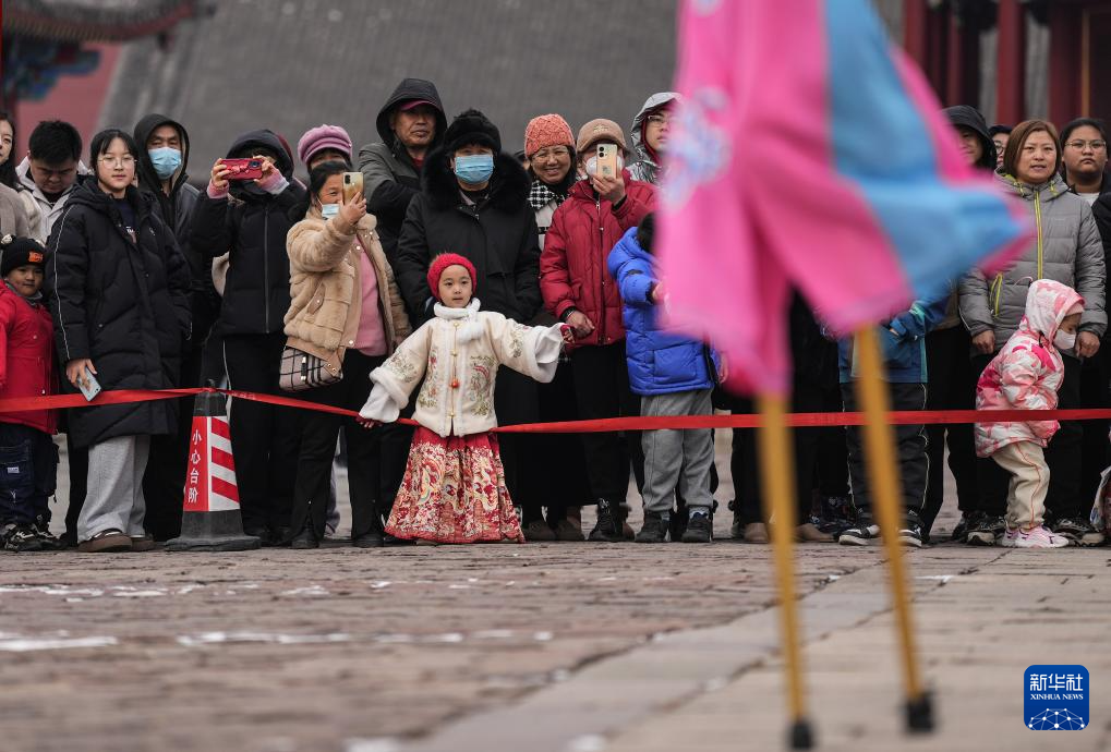 2月24日,游客在沈阳故宫博物院观看辽宁海城高跷展演。