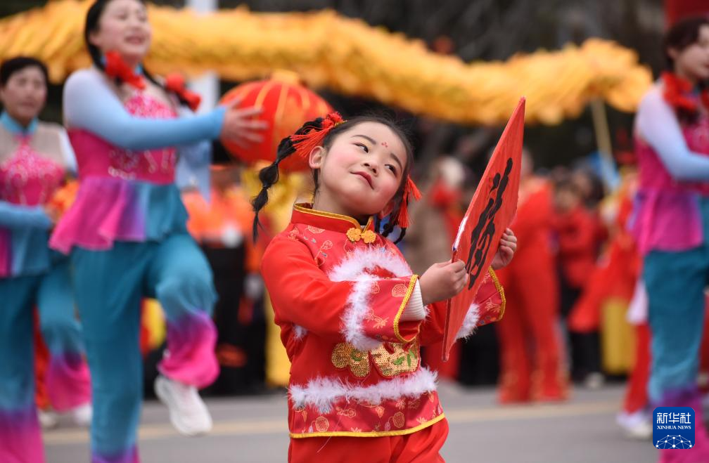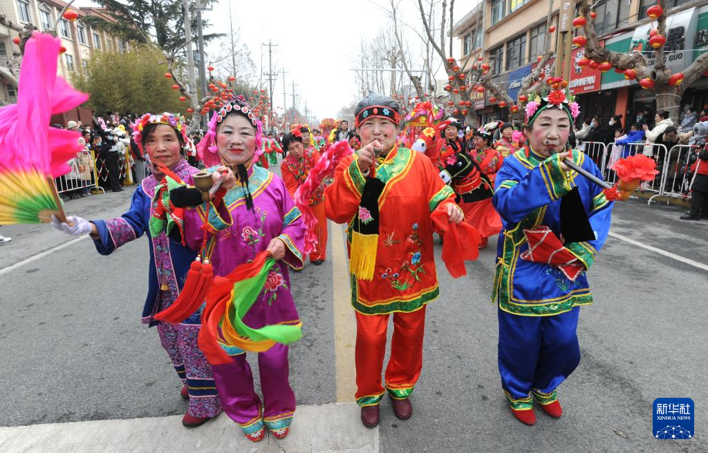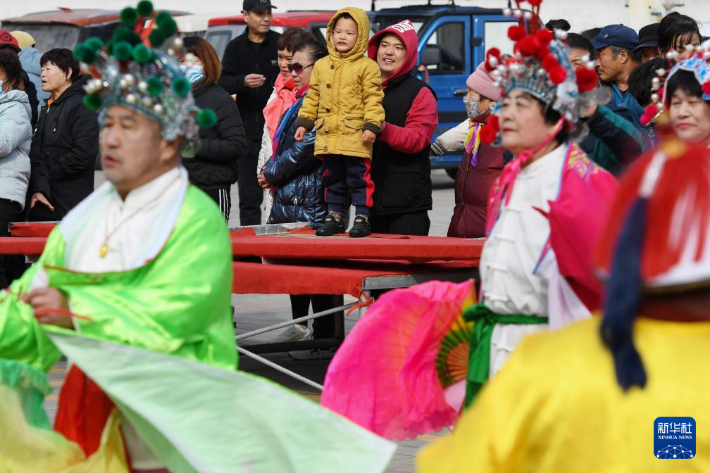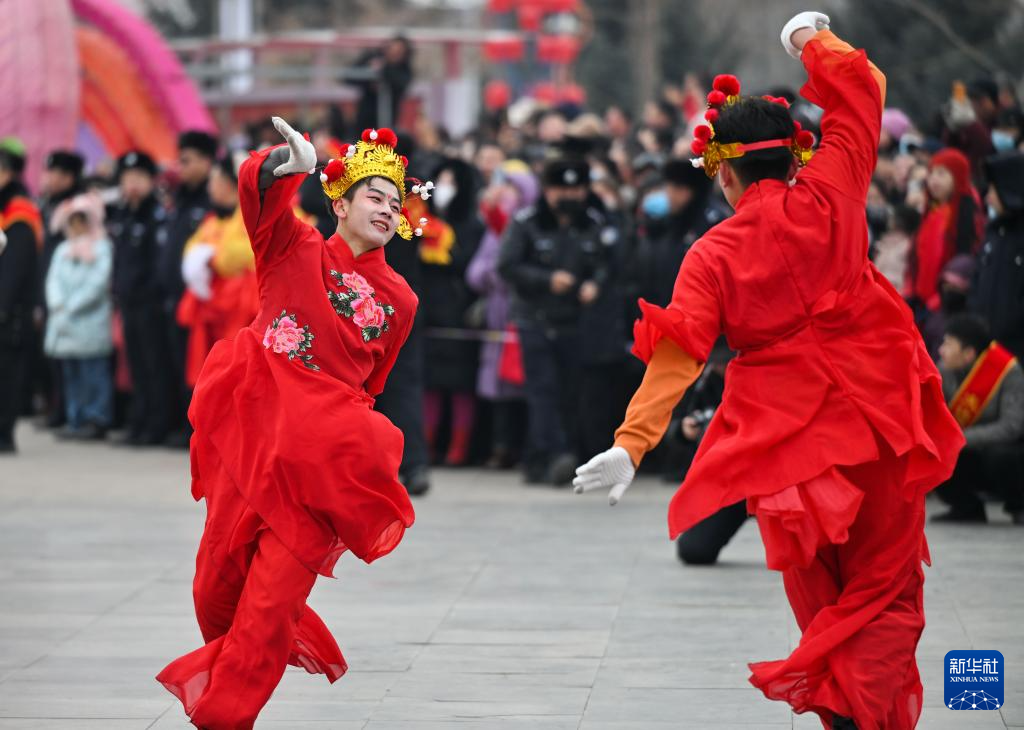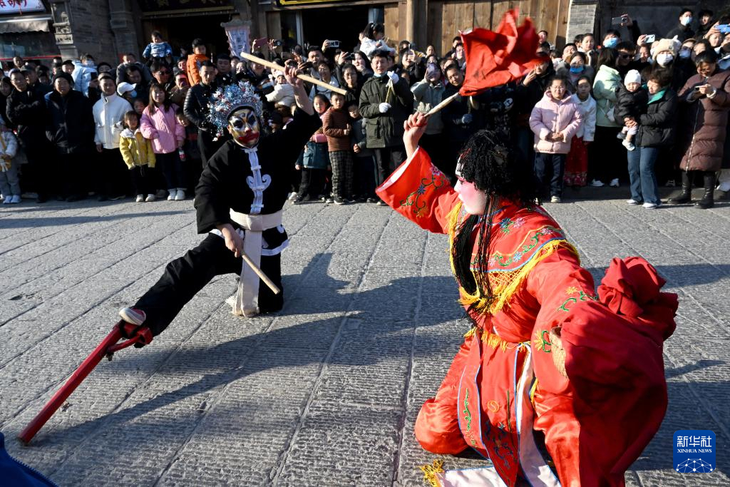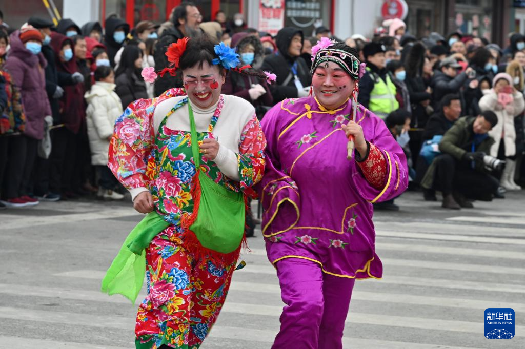 2月24日,演员在山西省大同市广灵县街头进行秧歌表演。