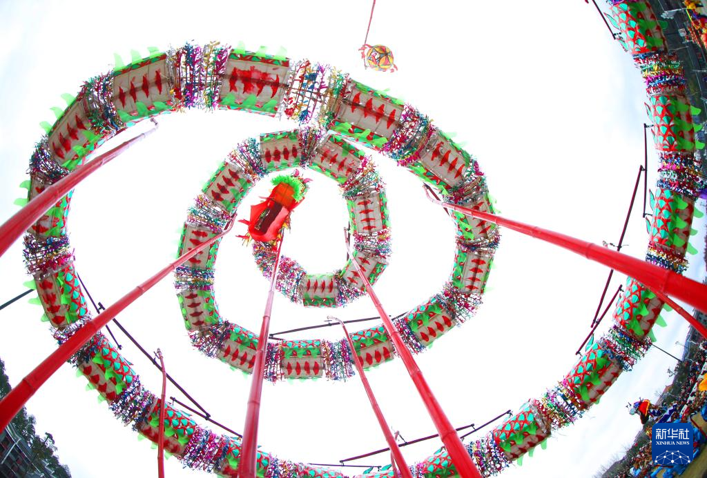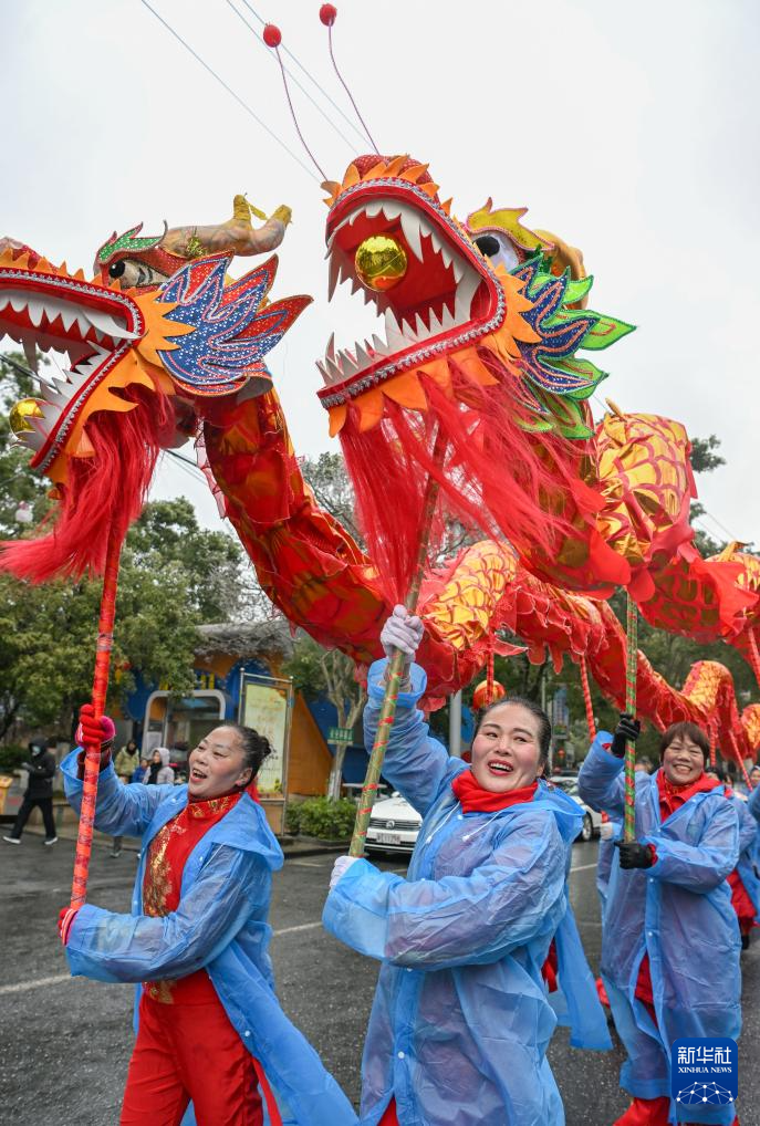 2月24日,民间艺人在湖南省衡阳市南岳区南岳镇万寿广场舞龙。