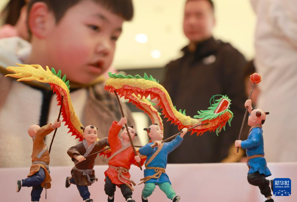 2月24日,在江苏南通龙腾江海过大年·南通元宵游园会非遗市集上,小朋友被面塑“舞龙”吸引。