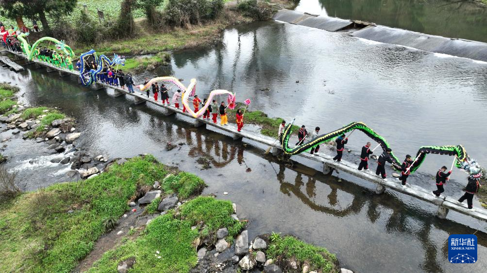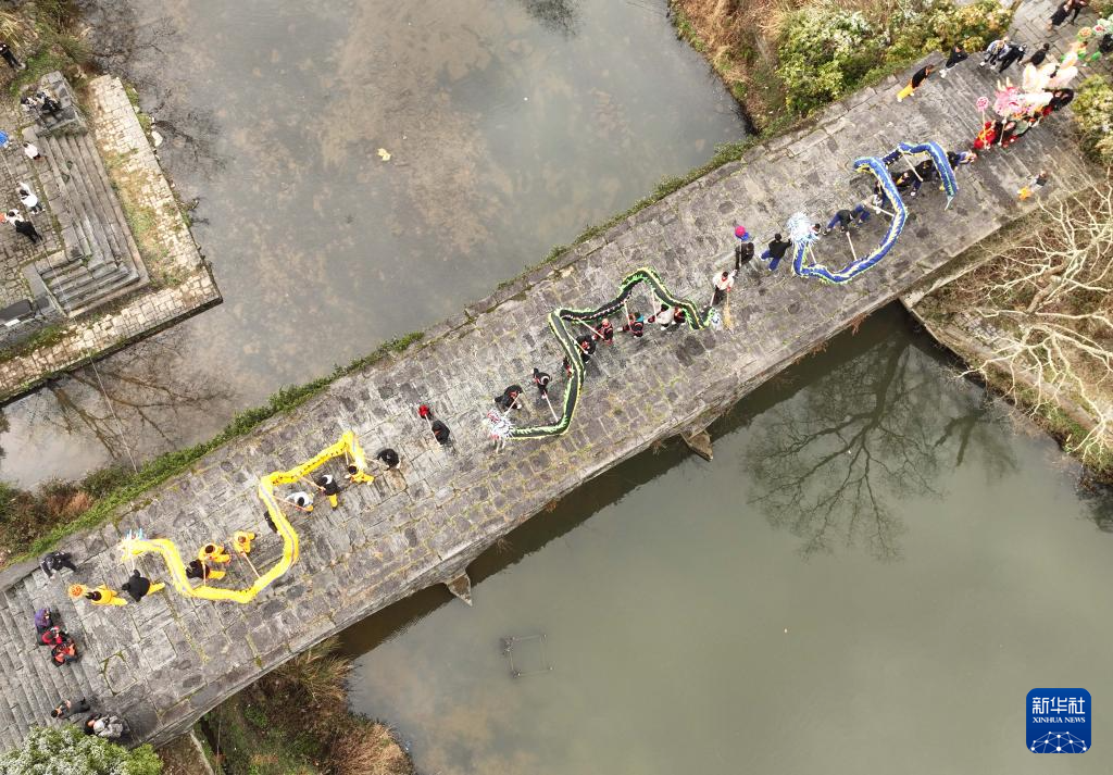 2月24日,贵州省黔东南苗族侗族自治州锦屏县隆里古城舞龙队在状元桥上舞龙(无人机照片)。