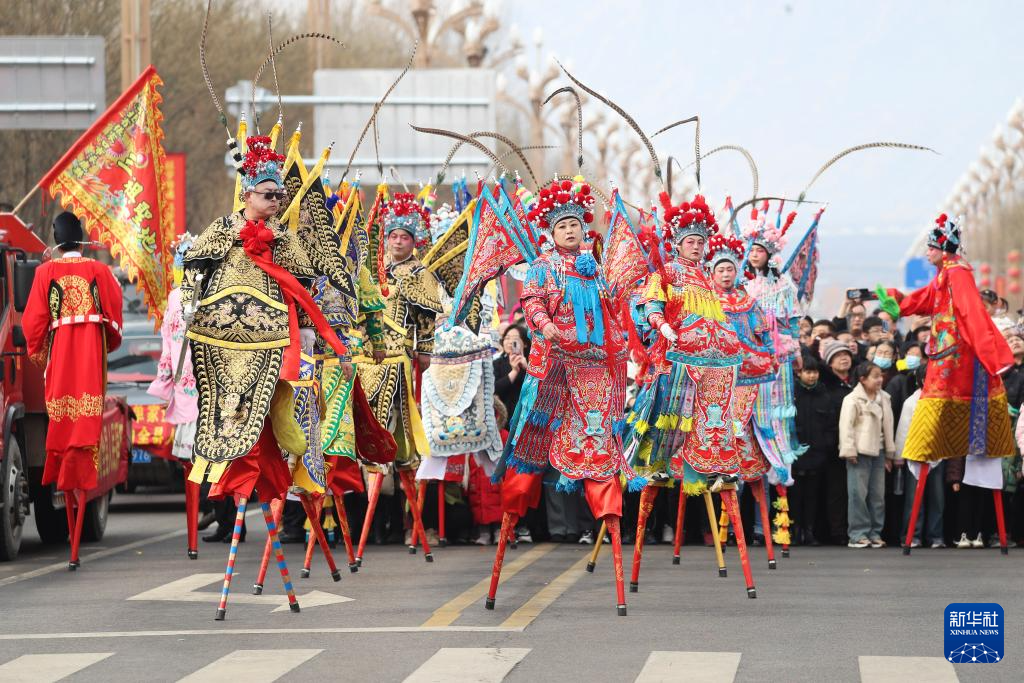 2月24日,乡村社火队演员在河北省涿鹿县的社火展演上进行踩高跷表演。
