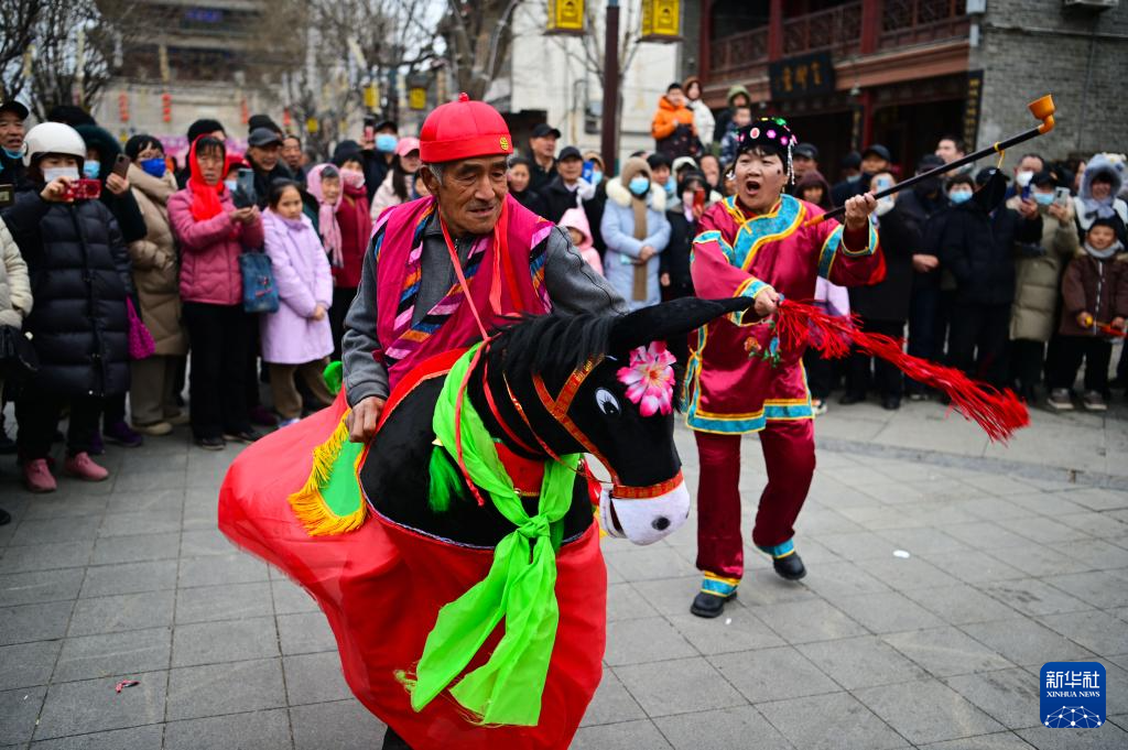 2月24日,民间文艺表演队在山东省聊城市中华水上古城景区表演“赶毛驴”。