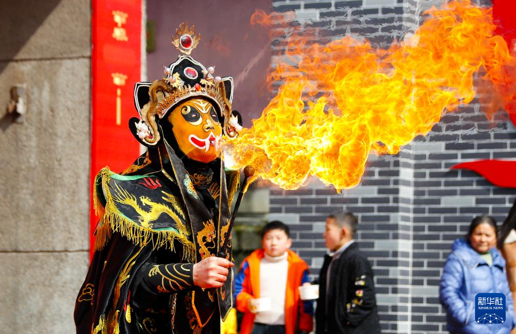 2月24日,演员在四川省巴中市巴州区表演传统川剧《变脸》。