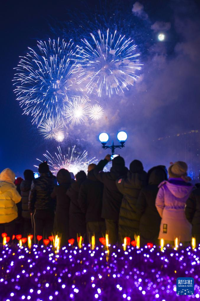 2月24日,在吉林省吉林市,游客在松花江畔观赏烟火表演。