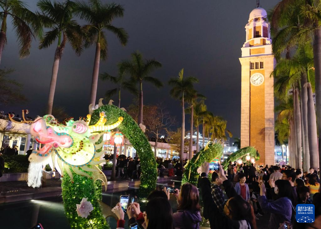 2月24日,人们在香港尖沙咀钟楼旁赏花灯。