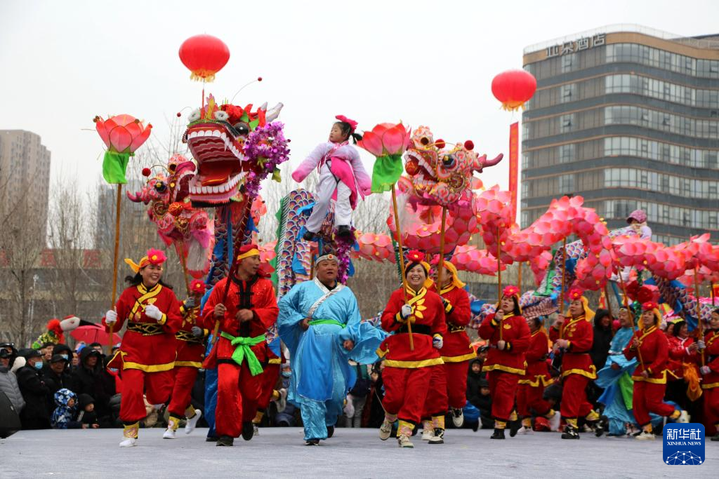 2月24日,舞龙秧歌队在山东临沂大剧院广场进行展演。