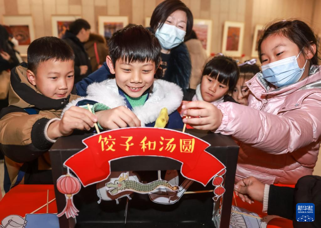 2月24日,在山东省滕州市美术馆,小朋友在“筑梦新时代·喜乐闹元宵”活动中参加“看图去展厅作品中寻宝”趣味游戏。