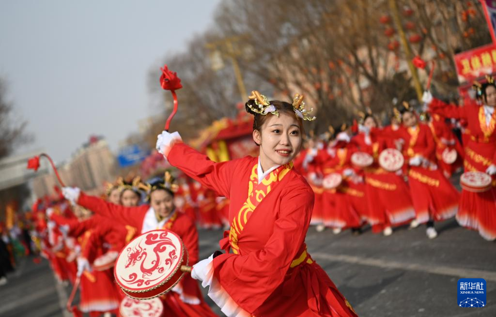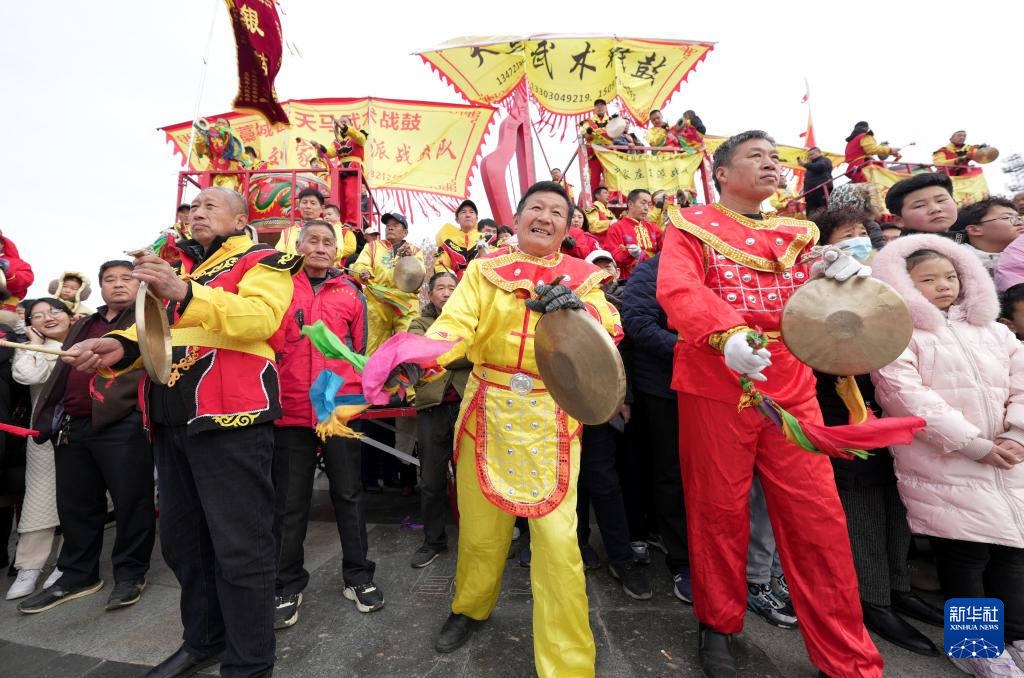 2月24日,在河北省石家庄市藁城区人民广场,民俗艺人在“战鼓催春”民俗展演活动中进行战鼓表演。