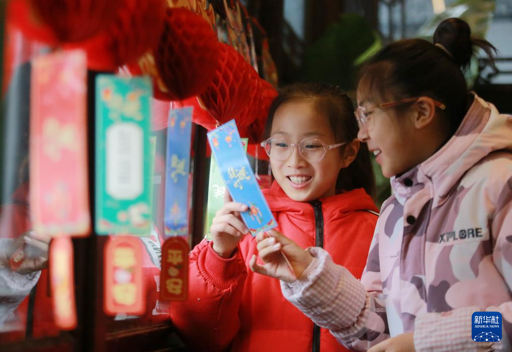 2月24日,小朋友在江苏省扬州市何园景区猜灯谜。