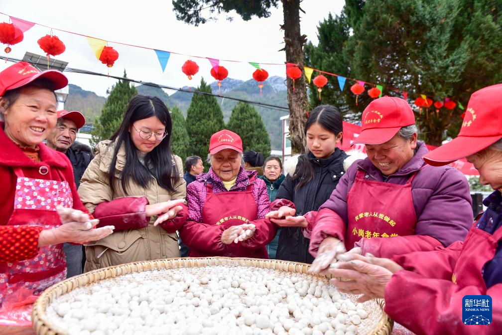 2月24日,在重庆市酉阳土家族苗族自治县小河镇小岗村老年食堂,青年志愿者陪老人一起做元宵、包汤圆。