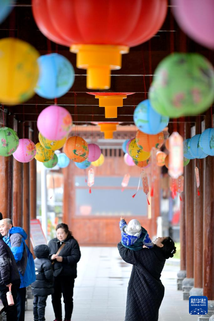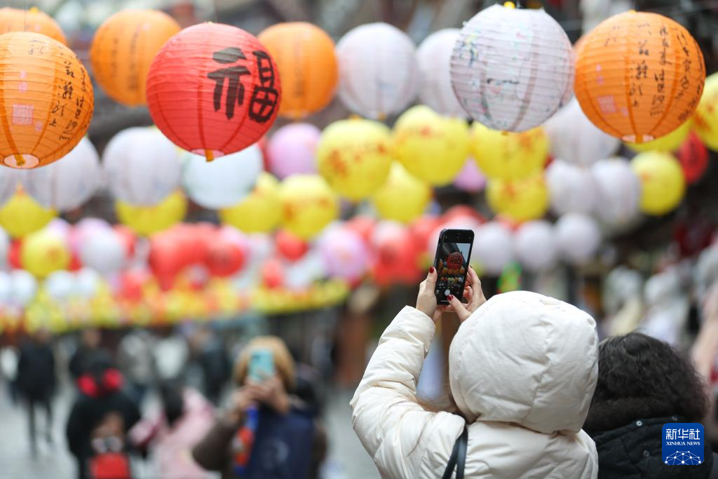 2月24日,市民在贵州省黔南布依族苗族自治州都匀市石板街赏灯拍照。