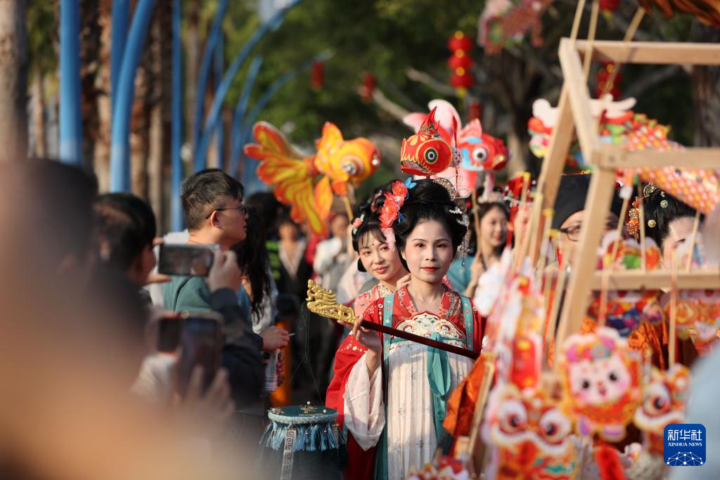 2月24日,演员身着传统服饰在福建省厦门市海湾公园举行的“元宵游园会”活动上巡游。