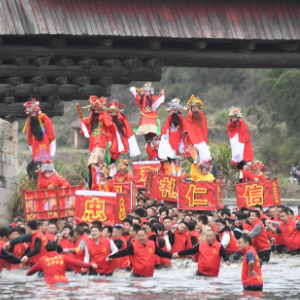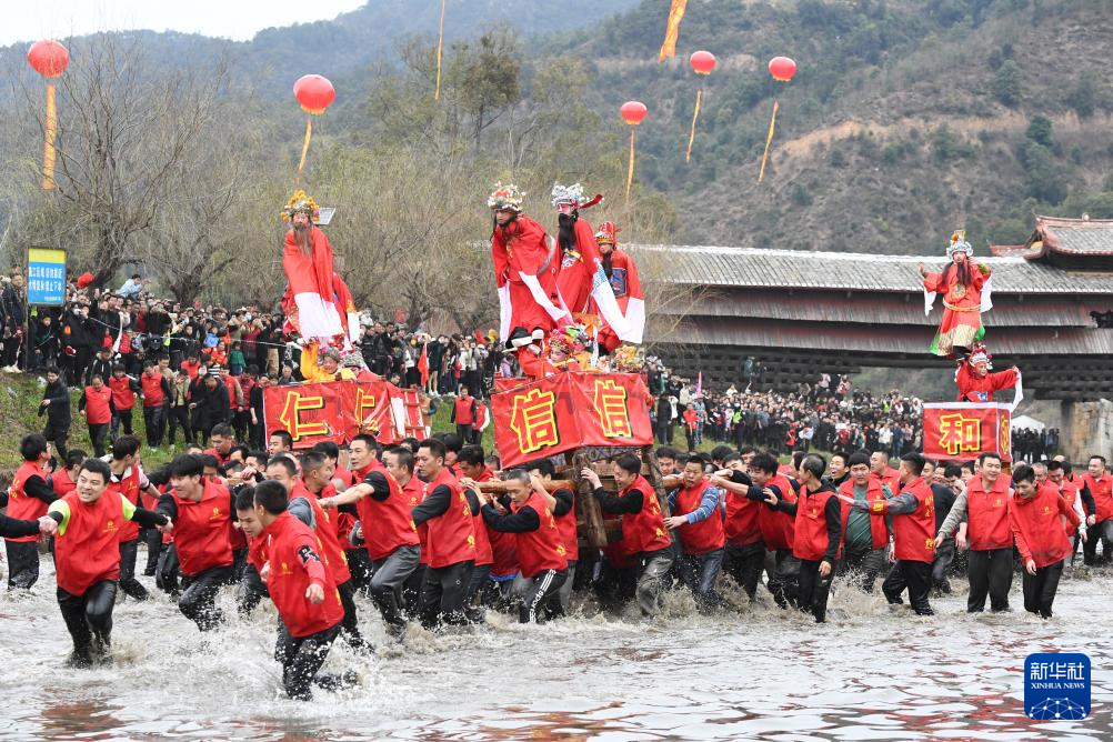 元宵佳节,福建省连城县罗坊乡举行独具特色的水陆“走古事”庆元宵活动。罗坊乡的“走古事”独具特色,是当地客家人为纪念祖先不远万里由中原迁徙而来举办的闹元宵活动,走古事队伍不但要在岸上狂奔竞速,更需在水中逆流争渡,展现先祖奋勇拼搏、力争上游的创业精神,以教育、激励后人,场面热闹非凡。
