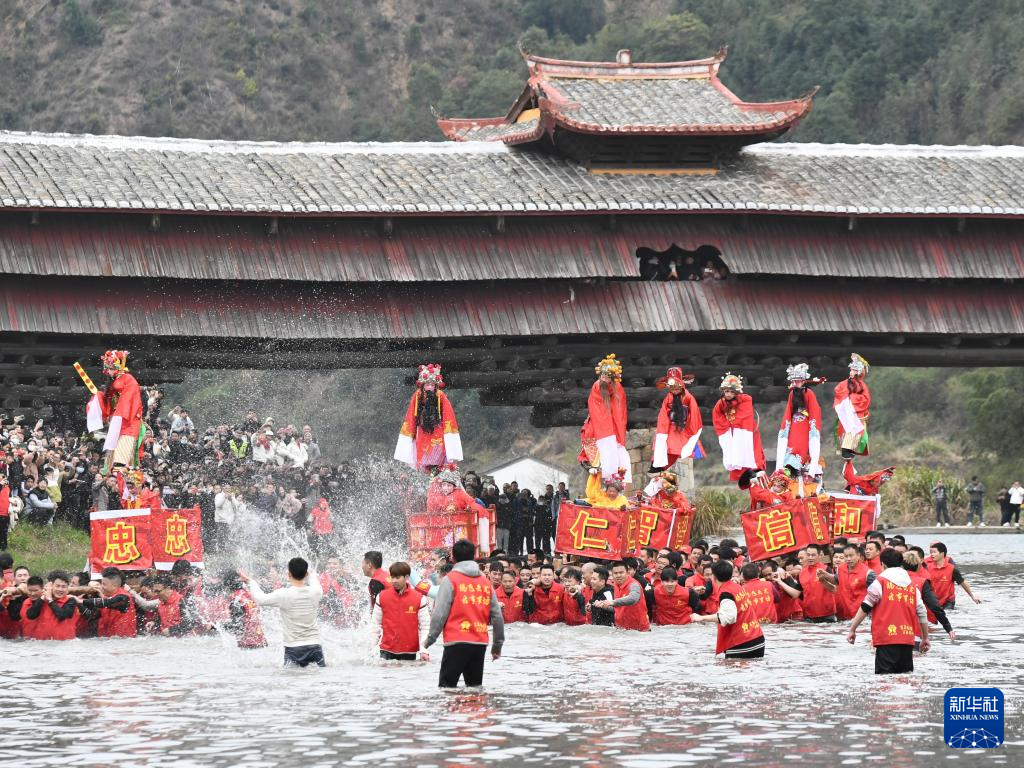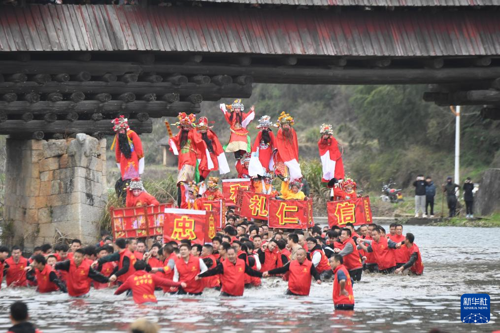 2月24日,福建省连城县罗坊乡走古事队伍穿过云龙廊桥,蹚着清岩河水前行。